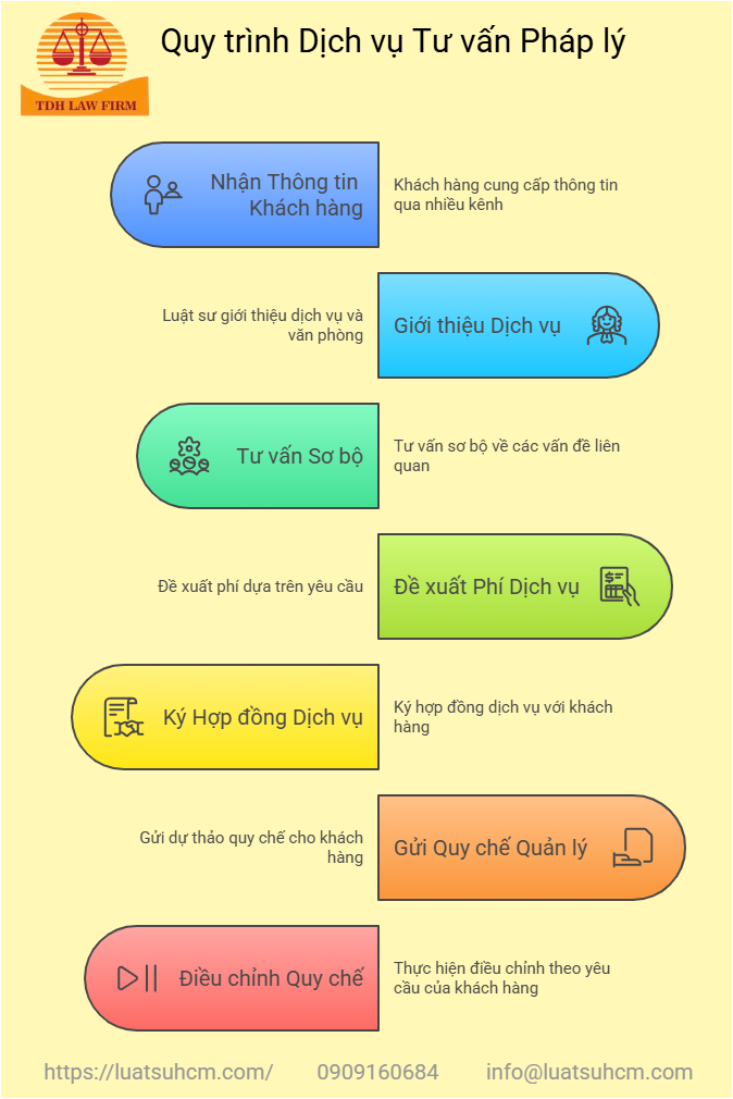 Luật sư/Chuyên viên pháp lý được phân công tiếp nhận thông tin sẽ giới thiệu sơ bộ về Văn phòng Luật sư và dịch vụ tư vấn soạn thảo Quy chế quản lý.